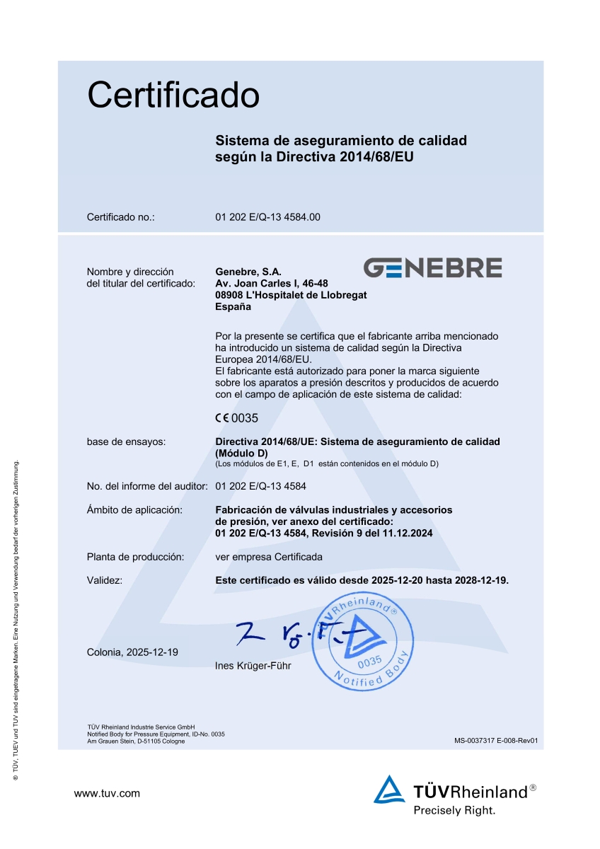 Desde el año 2000, GENEBRE aplica el Modelo Europeo de Excelencia Empresarial (EFQM), basado en la mejora continua y la excelencia en la gestión, que fue reconocido en 2003 con los Premios a la Calidad de la Generalitat de Catalunya. Este compromiso con la calidad se refuerza con la certificación de nuestro Sistema de Gestión Ambiental conforme a la norma UNE-EN ISO 14001:2015, otorgada por TÜV Rheinland, y nos permite ofrecer productos fiables, sostenibles y con un alto valor añadido.